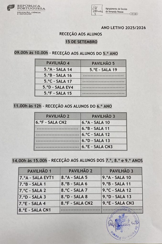 Informação sobre a Receção aos Alunos e Encarregados de Educação que irá decorrer no dia 15 de setembro.