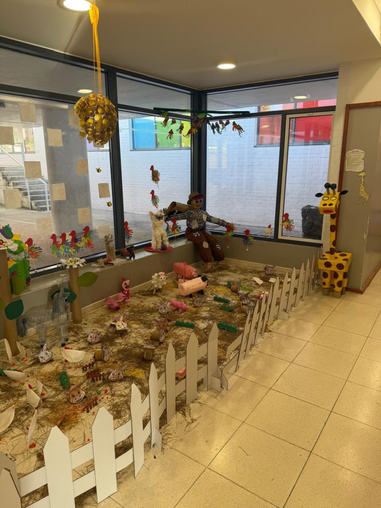 No final, construímos uma quinta todos juntos! Cada sala criou o seu animal utilizando materiais reciclados. A nossa Quinta Arco-Íris ficou muito colorida e cheia de vida, venham visitá-la!